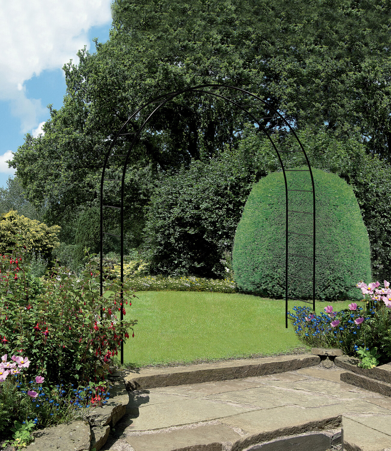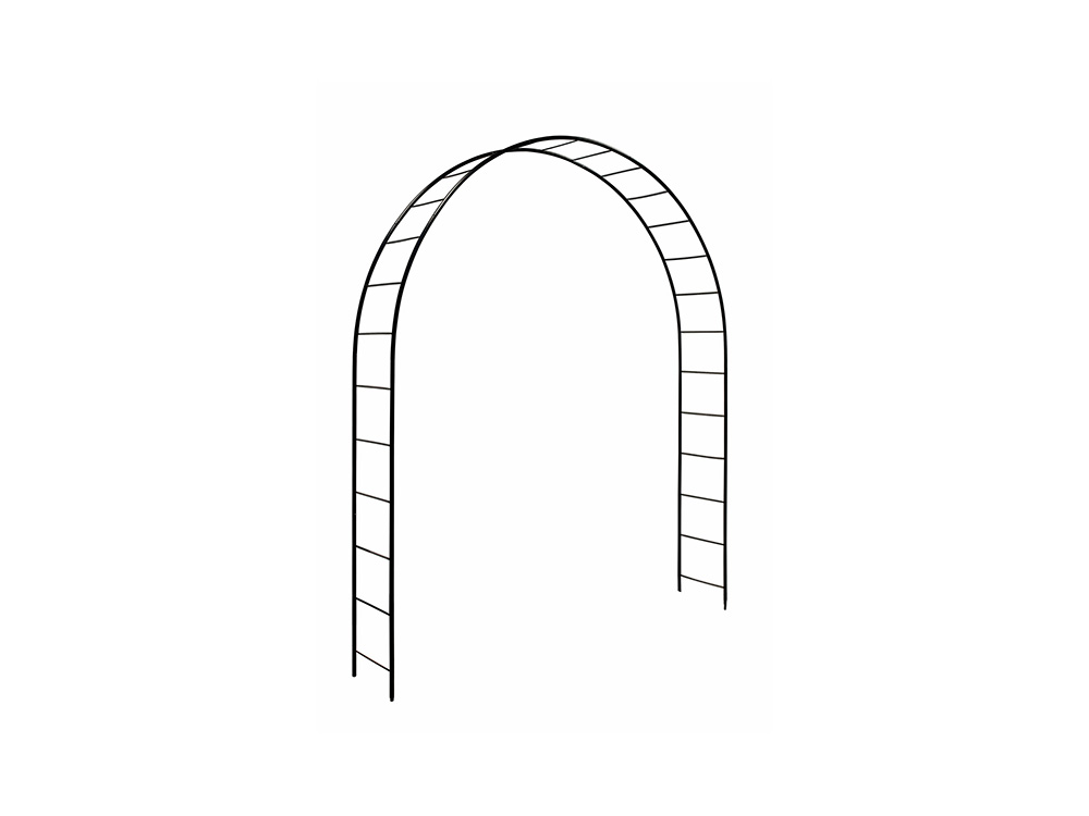 De rozenboog is kwalitatief afgewerkt met een zwarte coating. De boog kan 34 cm in de grond worden gemonteerd, bij voorkeur in een zandcementfundering voor extra stevigheid.