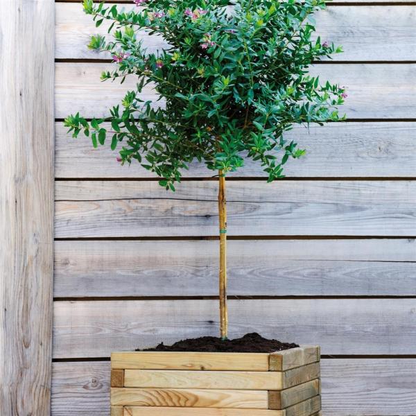 Deze massief houten bloembak is vervaardigd uit grenenhouten balkjes met een dikte van 4 cm, inclusief beschermend geotextiel. Deze mooie massieve plantenbak staat prachtig op elk terras en is geschikt voor talrijke kuipplanten. De bak wordt van de grond gescheiden door twee houten liggers.