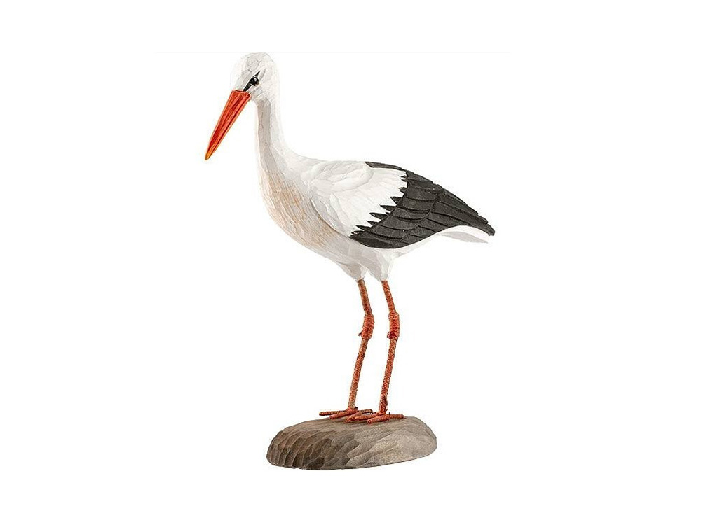 Ambachtelijk vormgegeven houten ooievaar. Deze aantrekkelijke miniatuur ooievaar is beschilderd met milieuvriendelijke verf.