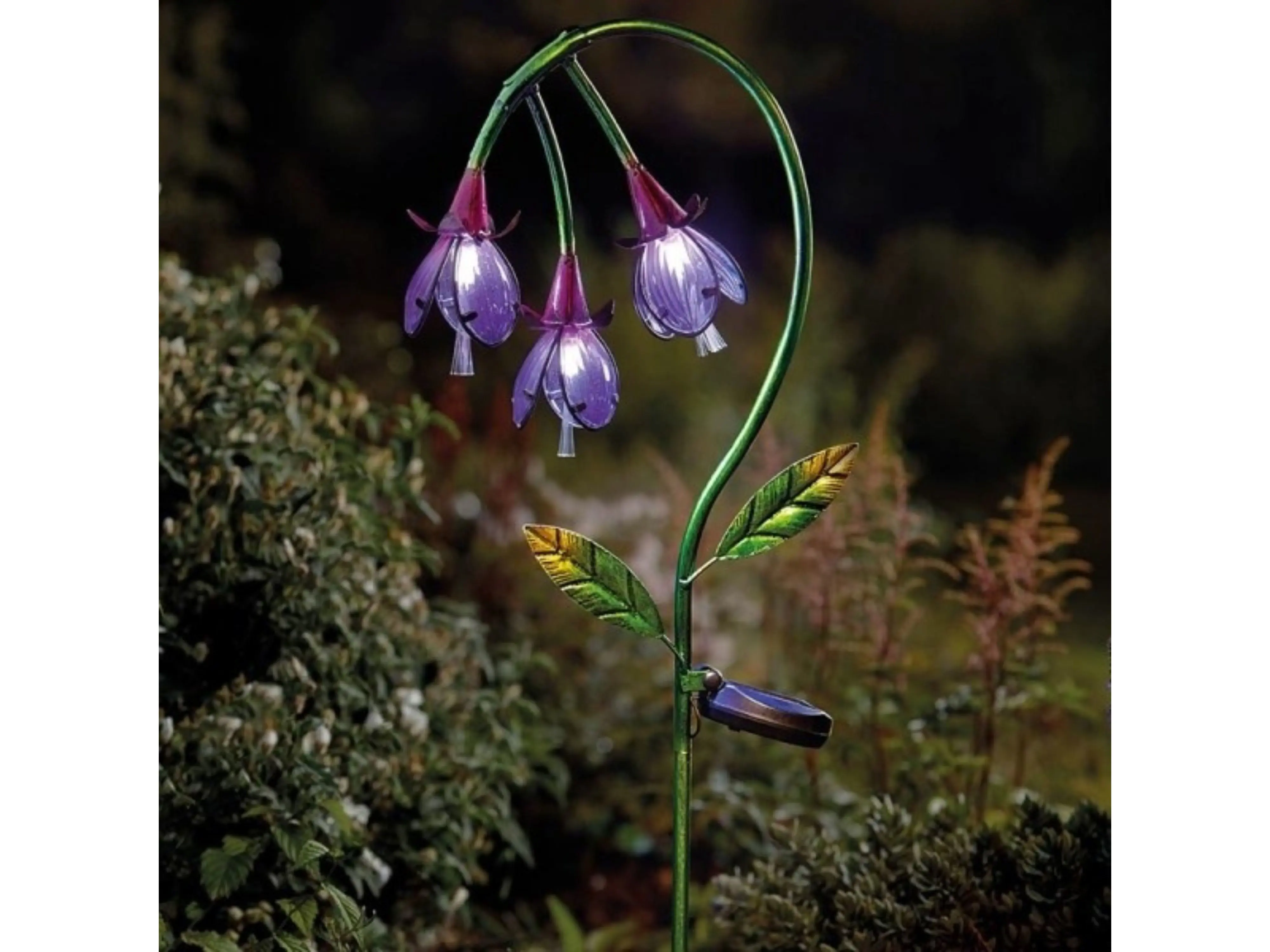 Deze bellenplant met drie paarse handgeschilderd glazen bloemen heeft een stevige metalen constructie in opvallend mooie kleuren. De verlichting gaat automatisch aan eens het donker wordt.
