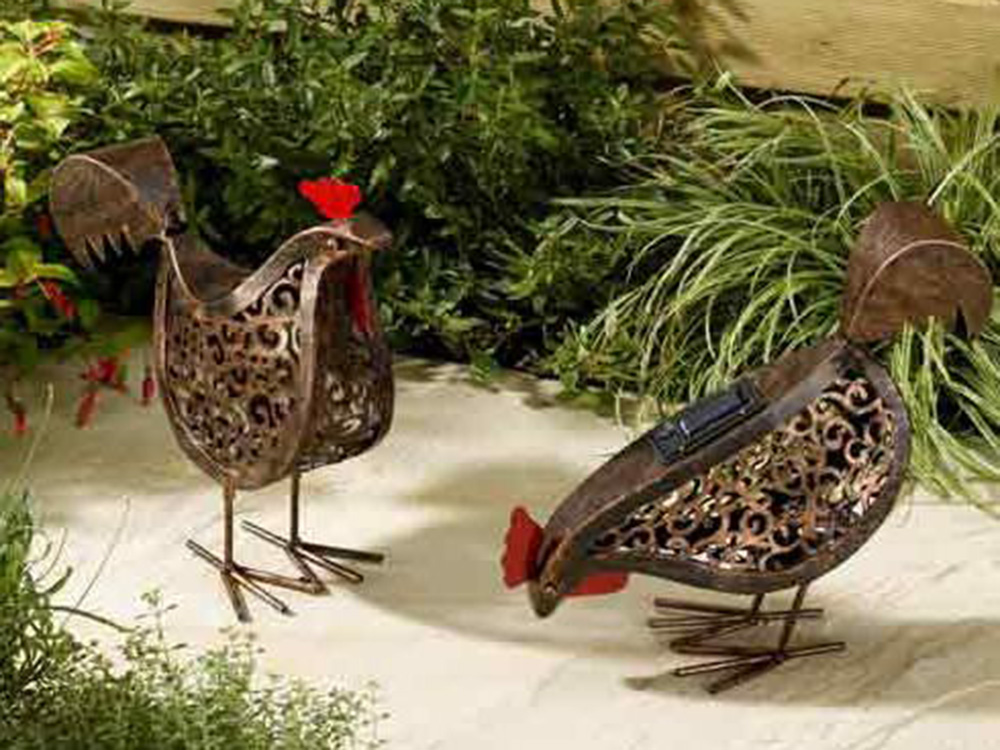 De vintage kippen zullen zeker en vast jouw gazon, border, patio, terras, ... verfraaien. Ze zijn vervaardigd uit metaal en de ingebouwde LED-verlichting kan ongeveer tot 8 uur branden wanneer de batterijen volledig opgeladen zijn.