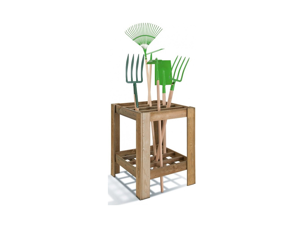 Houten gereedschapsrek voor het netjes opbergen van tuingereedschap zoals spades, schoppen, harken en bezems. Dit grenenhouten rek is zodanig opgebouwd zodat je het tuingereedschap handig rechtop in de voorziene rasters kunt zetten.