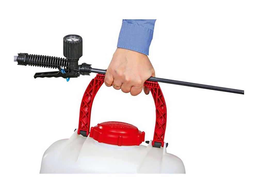 Ook de uitrusting van deze sproeier is uiterst professioneel met een Comfort vestelbare pomphendel, een op outdoorsport gebaseerd draagsysteem (harnas met verschillende instelmogelijkheden) en een handventiel met manometer. De stevige kunststof spuitlans aan deze manometer is bovendien telescopisch uitschuifbaar van 50 tot 90 cm.