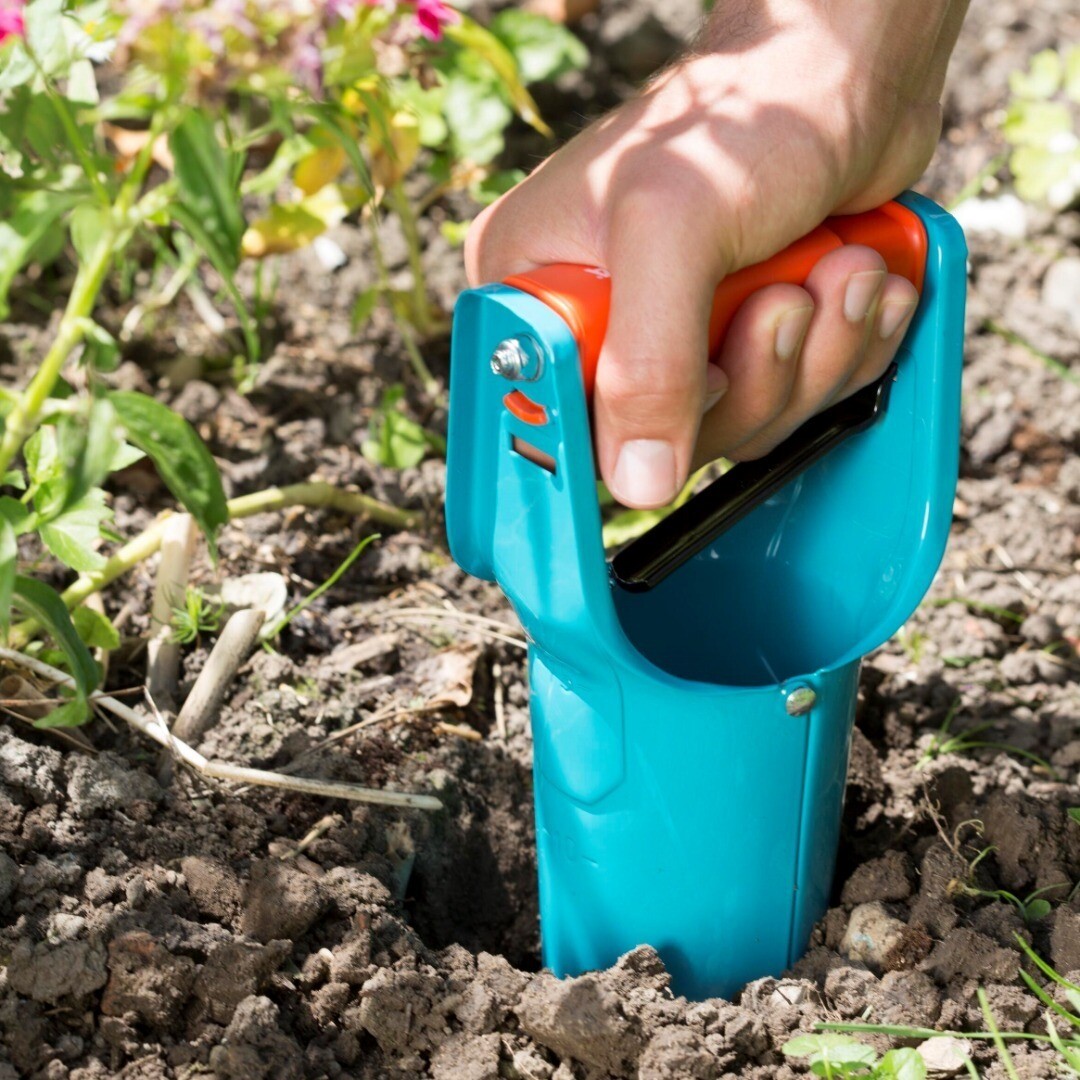 Kwalitatieve bollenplanter van Gardena met automatische aardeloslating. De automatische ontgrendeling op de handgreep maakt het gebruik uiterst handig en eenvoudig. De bollenplanter kan met één handbeweging worden geopend om de grond te lossen.