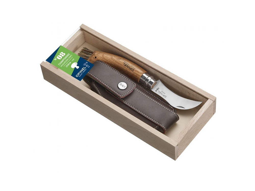 Dit paddenstoelenmes, gebaseerd op Opinel N°8, is een combinatie van een gebogen lemmet met gekartelde rug aan de ene zijde en een borstel uit everzwijnenhaar aan de andere zijde. Voor de handgreep werd gelakte eik gebruikt, een houtsoort met een hoog taninegehalte, uitzonderlijk resistent tegen insecten en schimmels.