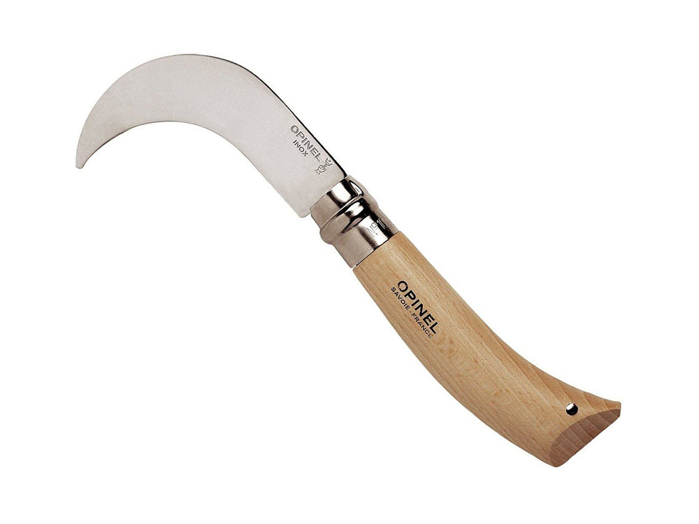 Dit snoeimes Opinel N°10, is voorzien van een gebogen lemmet van hoogwaardig staal, geslepen aan twee zijden, op een ergonomisch gelakt beukenhouten handvat.