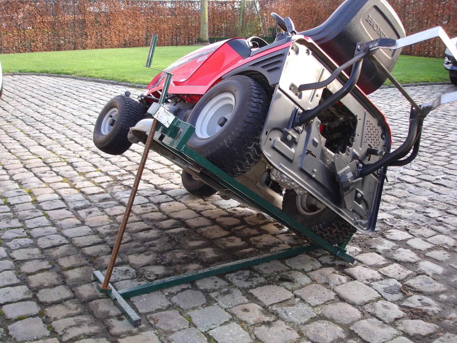 Stevige krik om de zitmaaier op te tillen bij het opkuisen of onderhoud. Met dit zeer eenvoudig te gebruiken kriksysteem gaat je zitmaaier tot maar liefst 400 kg moeiteloos de lucht in om de onderkant te reinigen, of voor het onderhoud en nazicht van de messen.