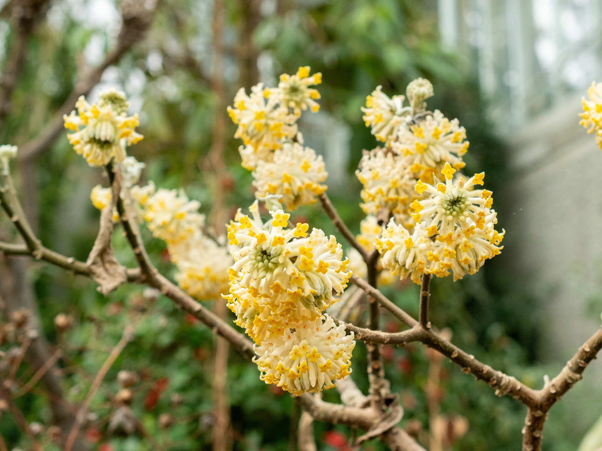 Edgeworthia grandiflora – winterbloeiende sierstruik met geurige trompetvormige bloemen.