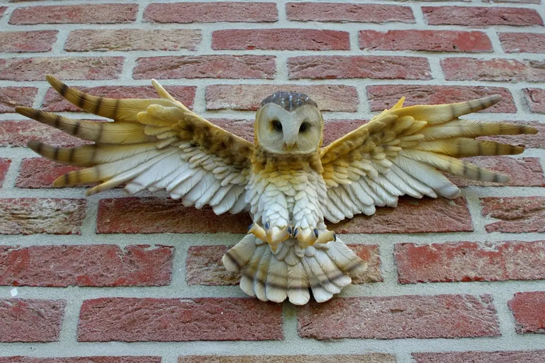 Prachtige decoratie van een kerkuil met open vleugels. De uil spreidt zijn vleugels uit om te landen of om zijn prooi te vangen. Dit muurbeeld is uniek en prachtig afgewerkt tot in detail: de pluimen, ogen, poten en kleuren van de uil vormen een waarheidsgetrouwe weergave van deze prachtige vogel.