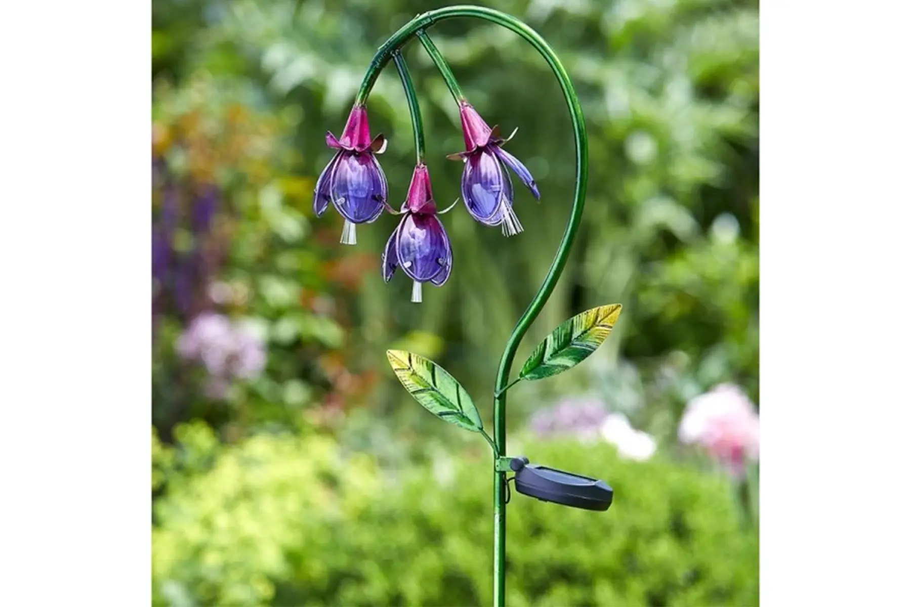 Deze bellenplant met drie paarse handgeschilderd glazen bloemen heeft een stevige metalen constructie in opvallend mooie kleuren. De verlichting gaat automatisch aan eens het donker wordt.