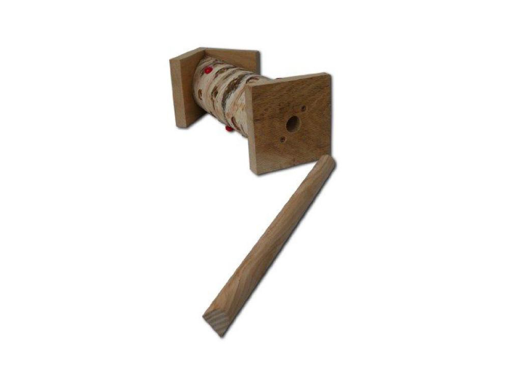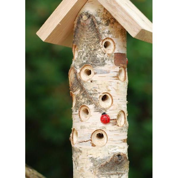 Langs de zijkanten van de sierlijke berkenstam zijn tal van gaatjes geboord, zorgvuldig ontworpen om insecten naar het hart van de stam te leiden, die gevuld is met stro. Deze gaatjes zijn schuin omhoog geboord, een slimme manoeuvre die ervoor zorgt dat de regen nooit binnen kan sijpelen, waardoor de natuurlijke materialen beschermd blijven tegen rotten.