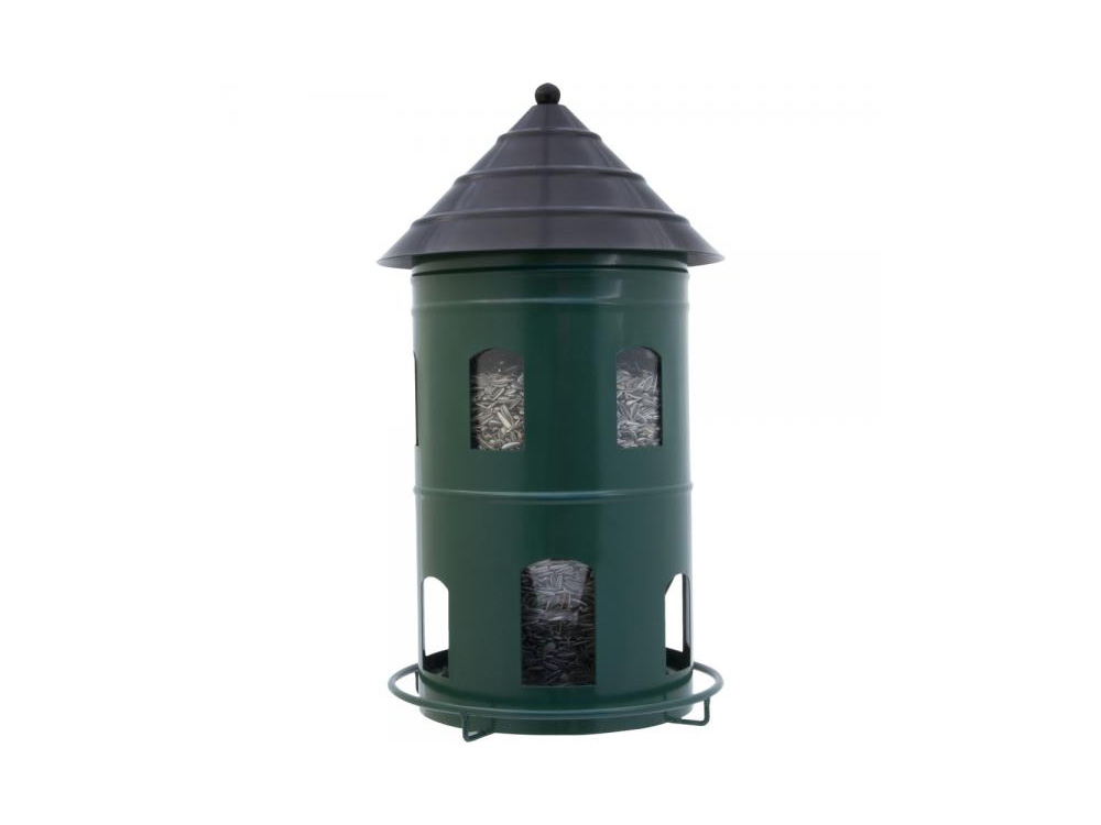 De reuze voedersilo heeft meerdere voerdispensers zodat veel vogels tegelijkertijd kunnen eten. Door de vele raampjes is het makkelijk van veraf te zien hoeveel de silo nog met voer gevuld is. De voedersilo wordt het best op een paal gemonteerd met de bijgeleverde schroef. Het voederhuis is gemaakt van waterbestendig gepoederlakt staal en de container van gerecycleerd kunststof.