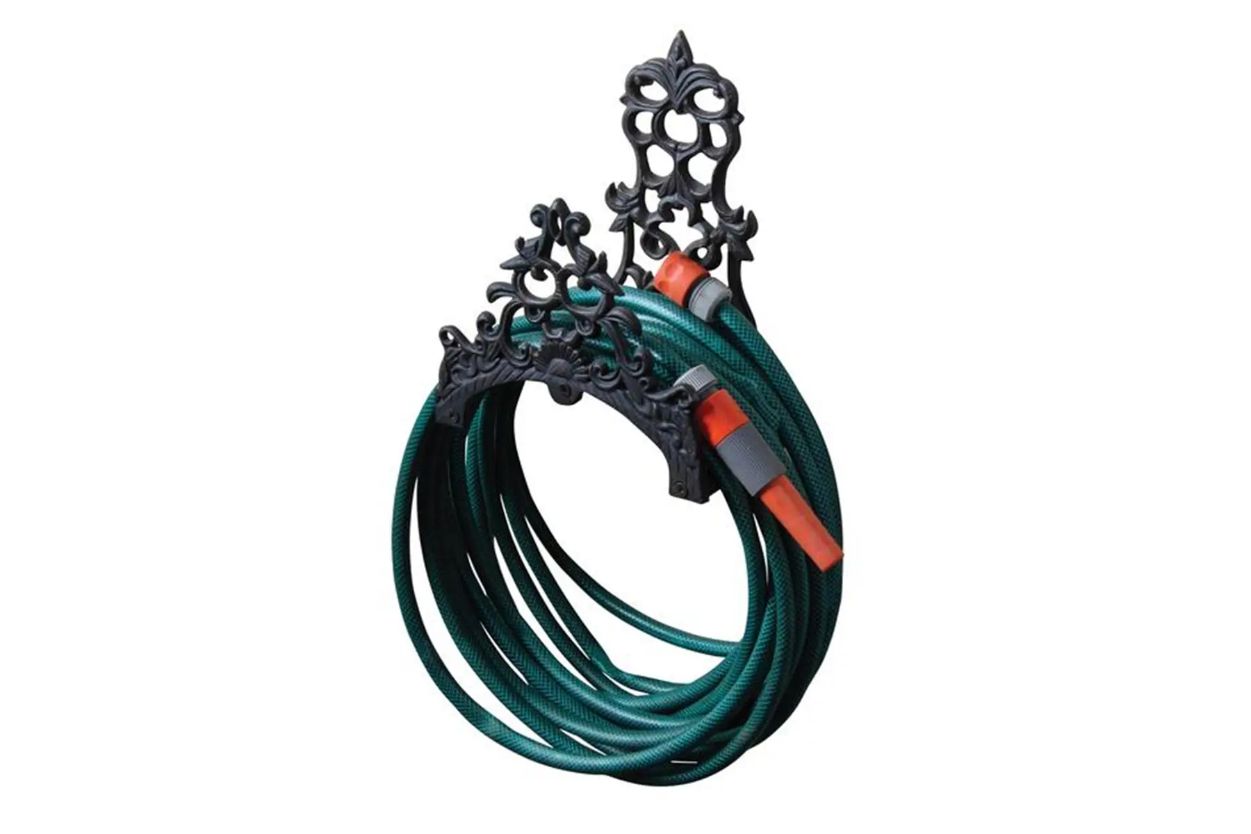 Zowel de voorzijde als de achterzijde van de tuinslanghouder heeft sierlijke vormen.