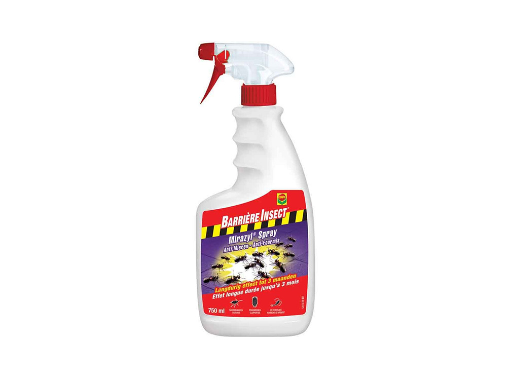 Barrière insect Mirazyl spray bestrijdt op een radicale manier mieren in en rond het huis, zoals op terrassen en balkons. Bestrijdt binnenshuis kruipende insecten zoals kakkerlakken, zilvervisjes en pissebedden.