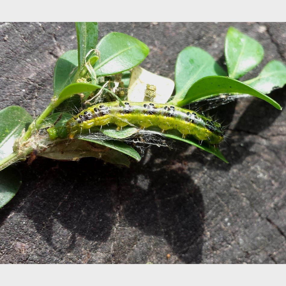 Ter info: de buxusmot is een nachtvlinder, 4 tot 4,5 cm grootte, met een crèmewitte kleur en een donkere bruine rand rondom de vleugels. Voortplanting: 3 generaties per jaar.