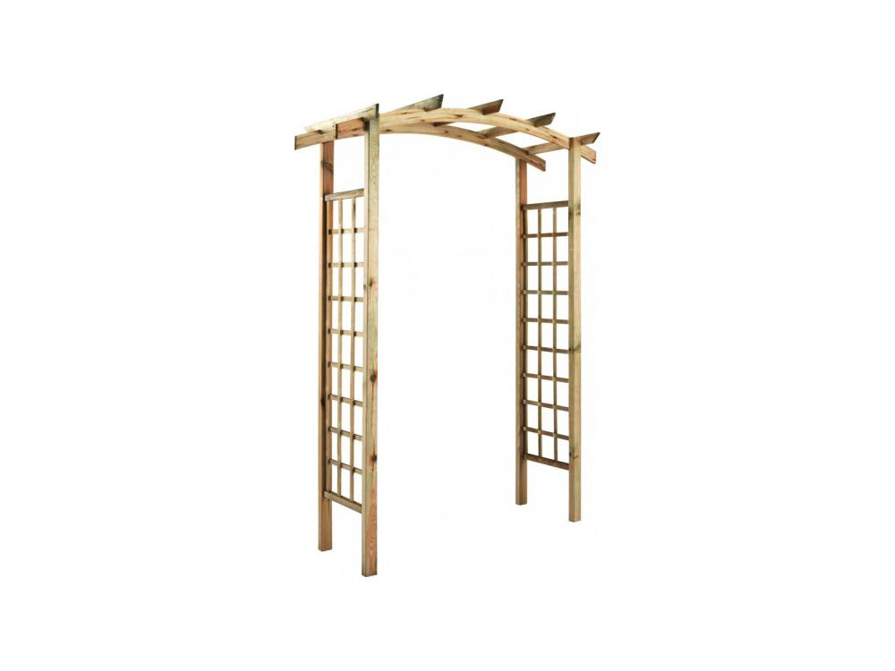 Plaats de rozenboog als doorgang naar een tuinkamer of als ingang rond de deur van een tuinschuur of rond de voordeur. Dit eenvoudige duurzame houten model bestaat uit twee zijden van houten traliewerk, en het kopvlak dat de klimramen verbindt is rond afgewerkt.