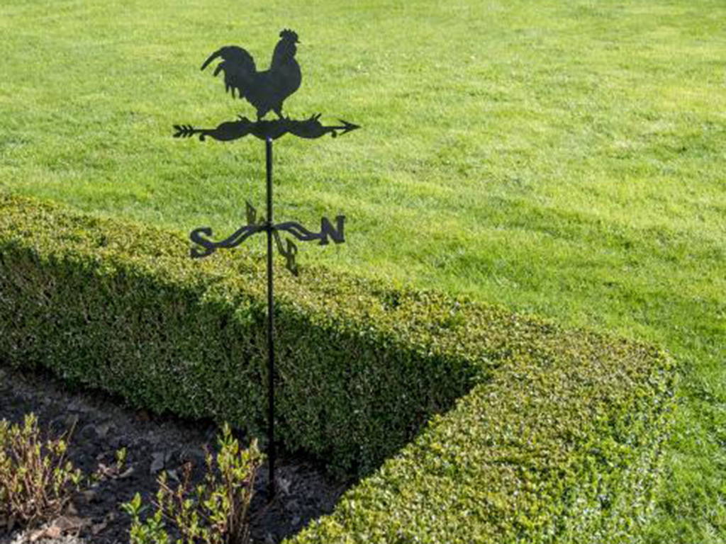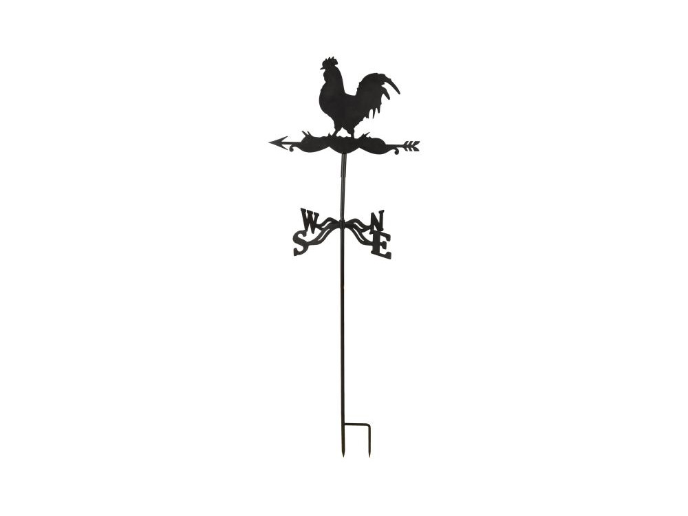 Een zwarte metalen windwijzer met een trotse haan. De windwijzer van Esschert design kan eenvoudig worden bevestigd aan een muurbeugel of een tuinprikker, en de montage is zeer eenvoudig. De hoogte van de windwijzer op de prikker is ongeveer 120 cm.