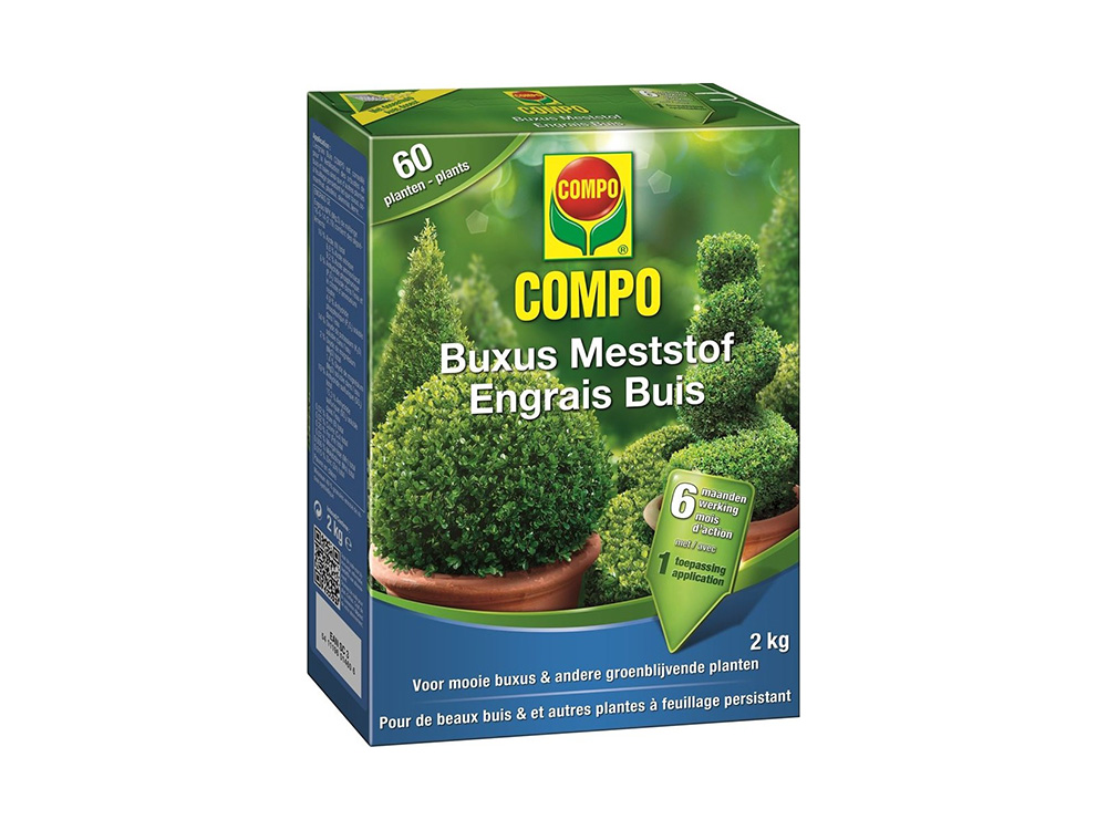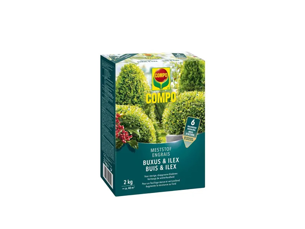 Compo meststof Buxus & Ilex voor een goede ontwikkeling van buxus, Ilex, Liguster, hagen, groenblijvende planten, (haag)beuken en Berberis. Het garandeert een gezonde plantenontwikkeling, een dichte bladgroei en diepgroene bladeren met een hoge weerstand tegen droogte.