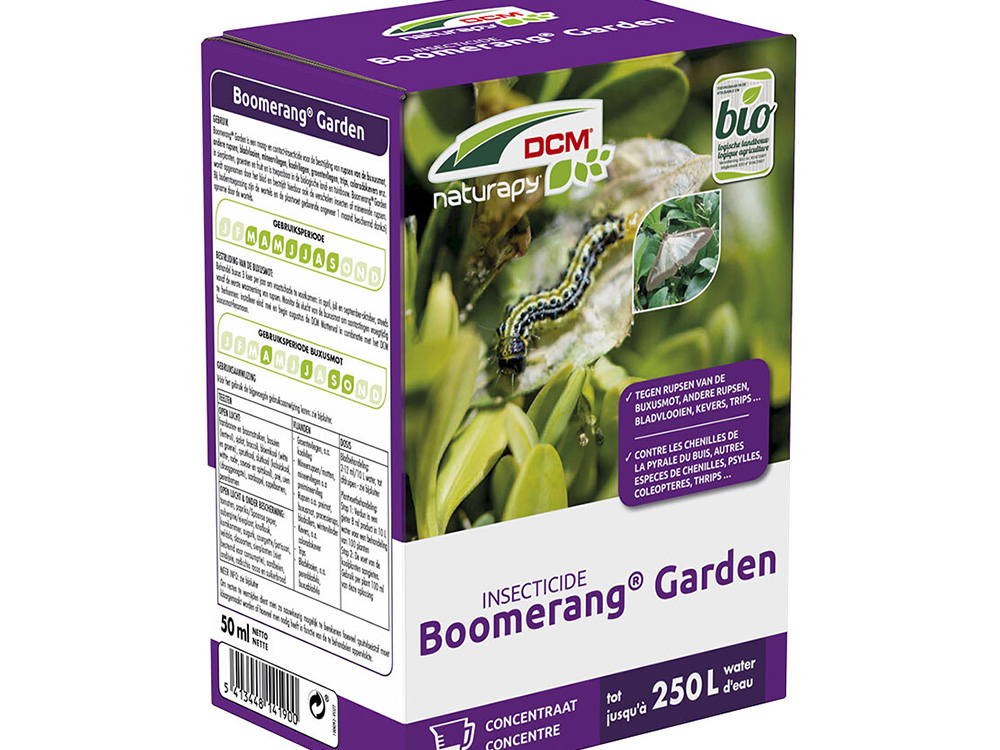 Boomerang Garden van DCM is ideaal voor het bestrijden van rupsen van de buxusmot, andere rupsen, bladvlooien, mineervliegen, koolvliegen, groentevliegen, (colorado)kevers, trips,… in sierplanten.