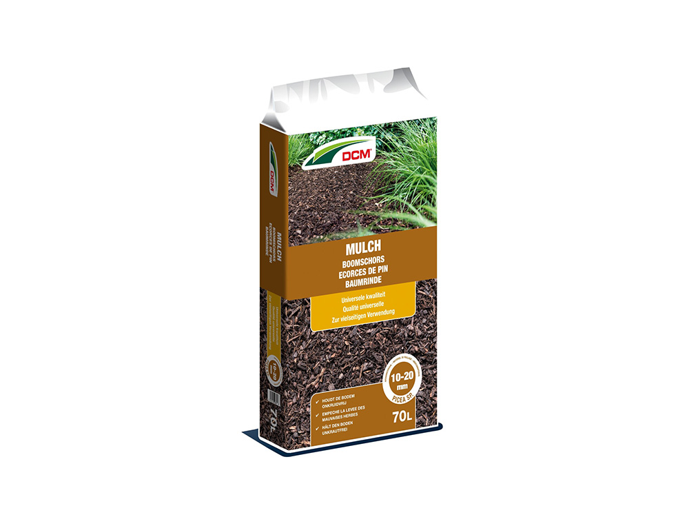 Mulch van DCM als budgetvriendelijk afdekmateriaal in de tuin en moestuin tussen de beplanting en gewassen. De boomschors is uitgezeefd op een fractie van 10 tot 20 mm. Een mulchlaag beschermt de bodem tegen, uitdroging en vorst en voorkomt als fysische barrière ook onkruidgroei. De schors verteert vrij snel.