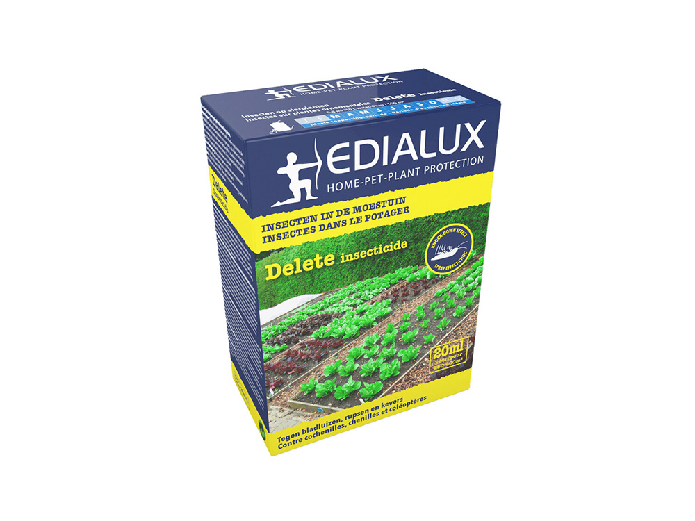 Insecticide voor een snelle bestrijding van bladluizen, rupsen en kevers in de moestuin. Delete insecticide van Edialux werkt binnen enkele minuten in op insecten, die onmiddellijk stoppen met het beschadigen van de gewassen, ook al sterven ze pas later.