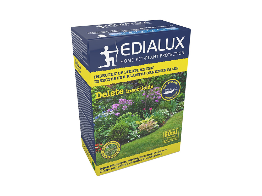 Insecticide voor snelle bestrijding van rupsen zoals die van de buxusmot in de siertuin. Delete insecticide van Edialux werkt binnen enkele minuten in op insecten, die onmiddellijk stoppen met het beschadigen van de gewassen, ook al sterven ze pas later.