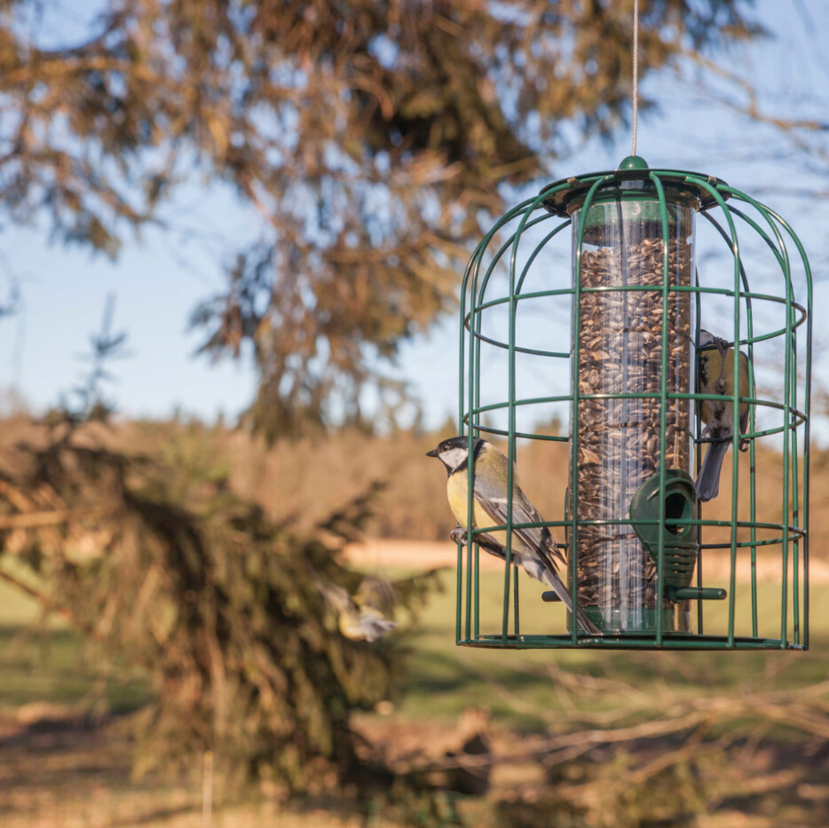Deze donkergroene zadenvoedersilo van Esschert design is omgeven door een stevig gaasraster waardoor hij enkel toegankelijk is voor kleine vogels zoals meesjes, mussen, roodborstjes,... Het voorkomt dat grotere vogels zoals eksters, kraaien, duiven,... of eekhoorns de kleinere vogelsoorten verjagen of al hun voeder opeten.