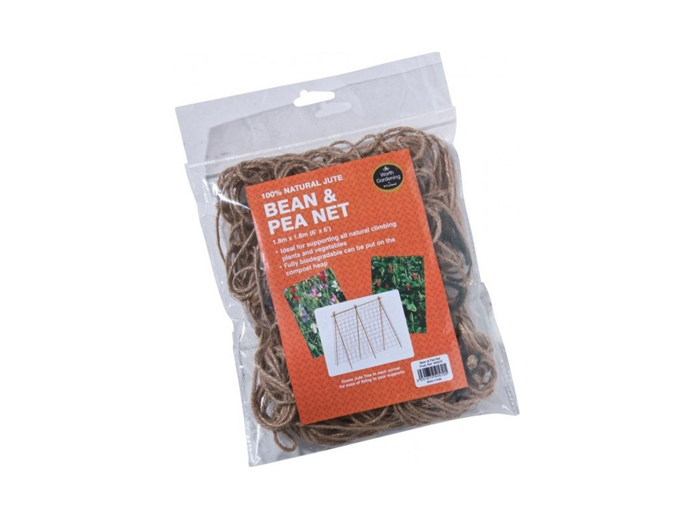 Hoge soorten klimbonen en klimmende erwten hebben een net nodig om hun stengels langs te laten groeien. Dit net gemaakt uit jute, zorgt voor een stevige verticale en horizontale groeiconstructie. Op elke hoek is een groen touw voorzien om het net eenvoudig aan de palen te kunnen vast maken.