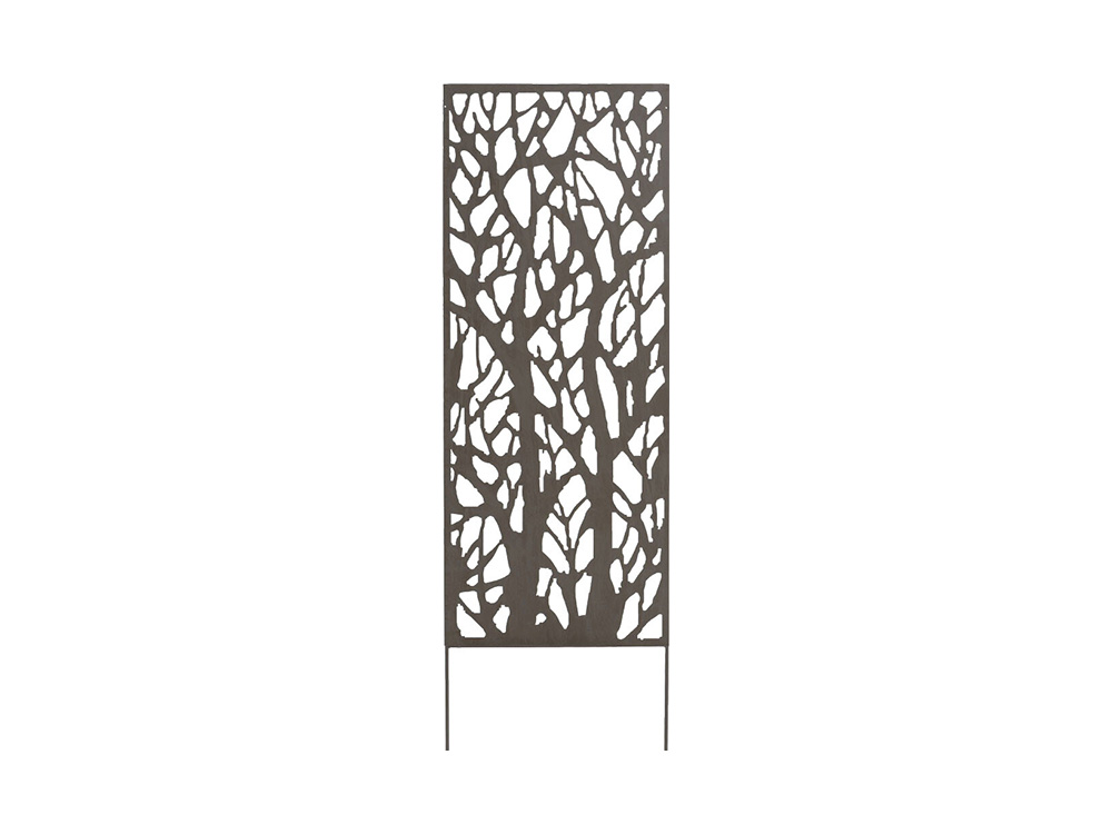 Plaats het rooster met de twee grondprikkers in de grond of bevestig het aan een muur. Het decoratief paneel bestaat uit gelast metaal met een roestige look waardoor het duurzaam en weersbestendig is.