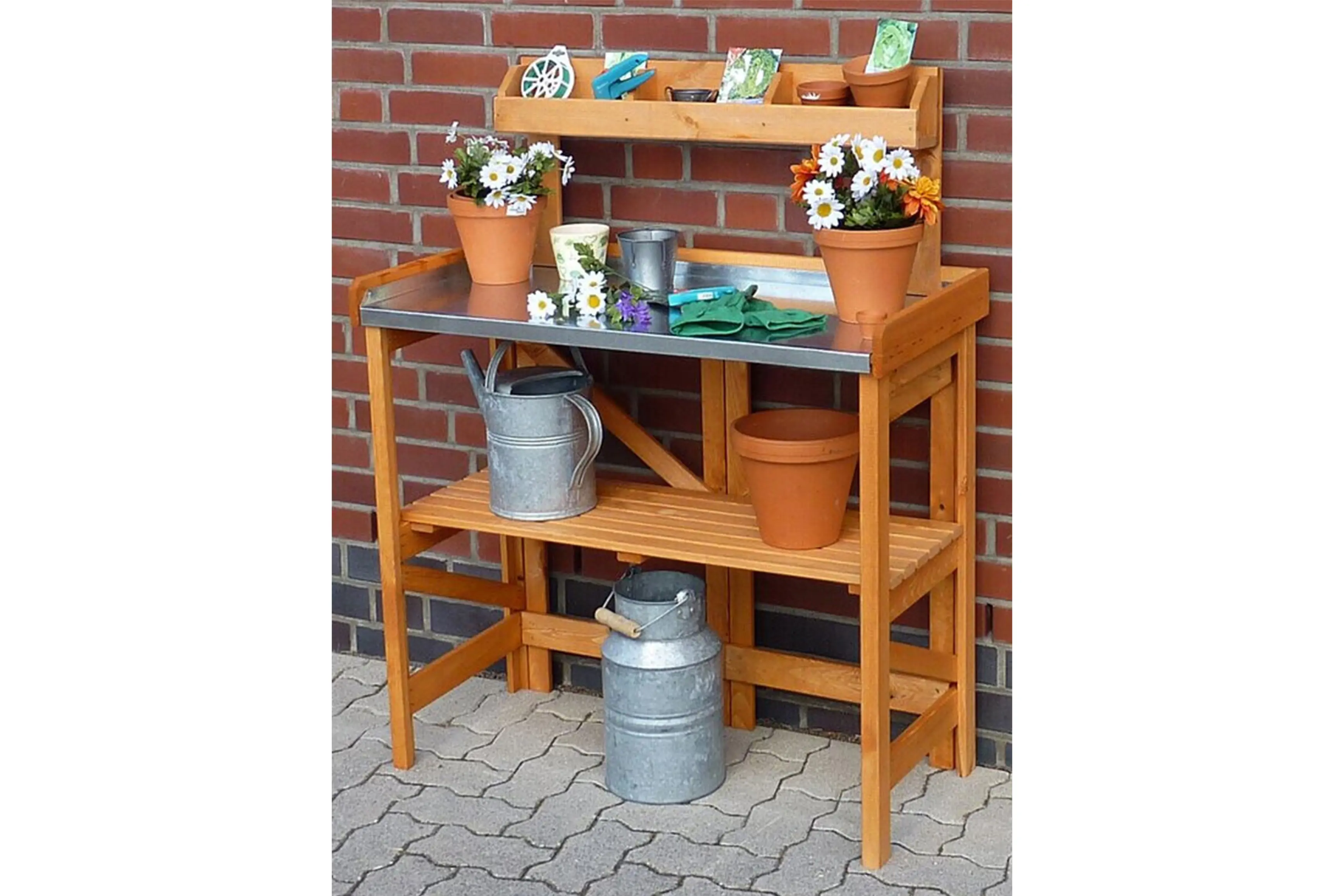 Deze stevige en praktische oppottafel met verzinkt werkblad is gemaakt uit massief geïmpregneerd grenenhout. Het hout heeft een honingbruine kleur en is goed weerbestendig.