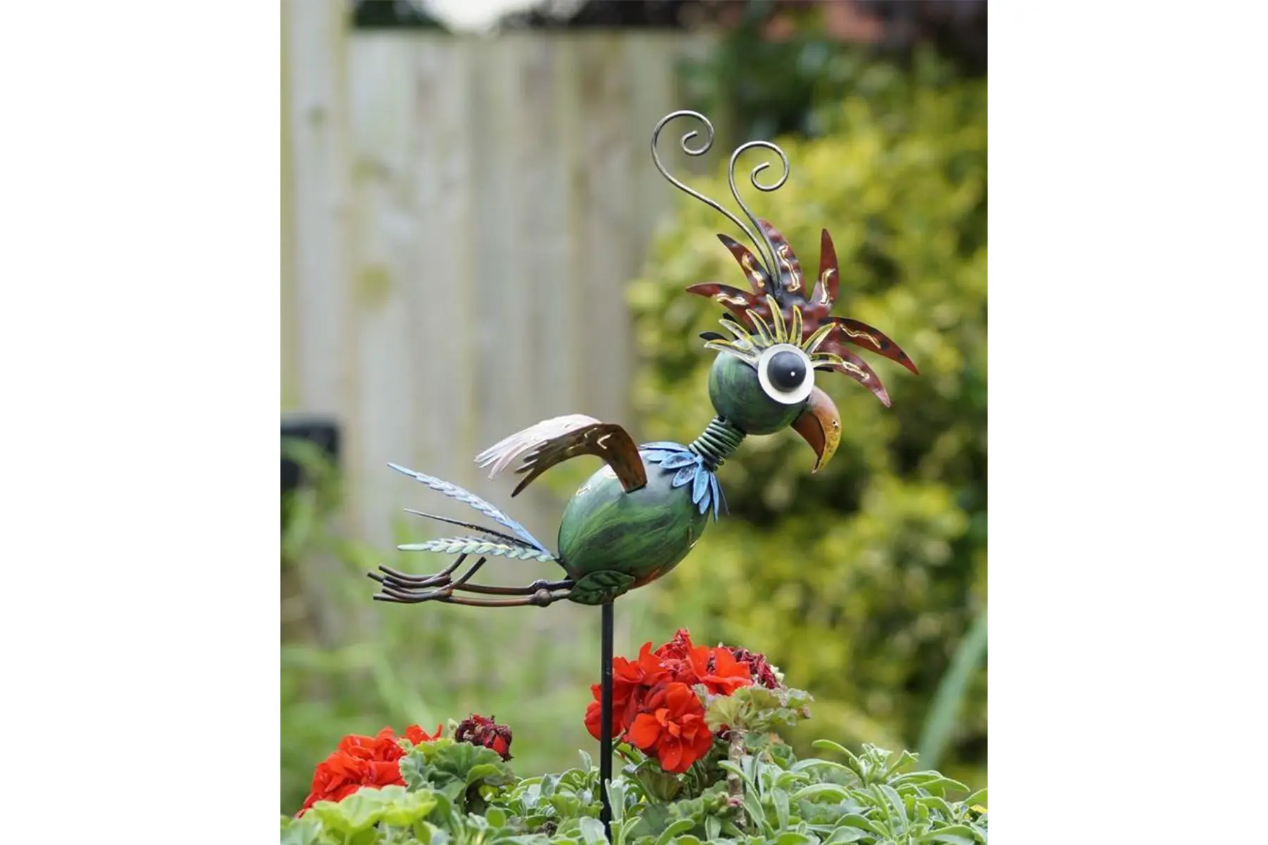 De papagaai is voorzien van een prikker waarmee je de decoratie zowel in de plantenborder als in een bloembak kan prikken.