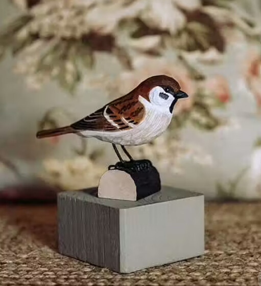 De ringmus (Passer montanus) is op ware grootte weergegeven en beschilderd met milieuvriendelijke verf.
