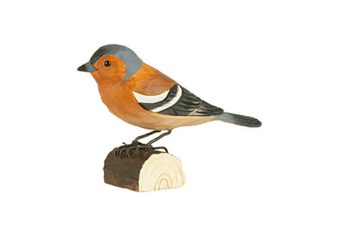 Ambachtelijk vormgegeven houten vink. De vink wordt op ware grootte weergegeven en is beschilderd met milieuvriendelijke verf.