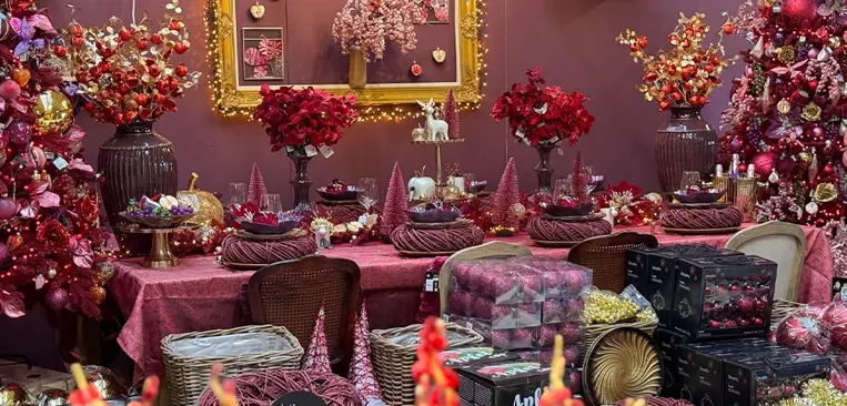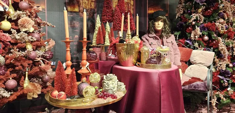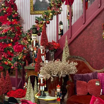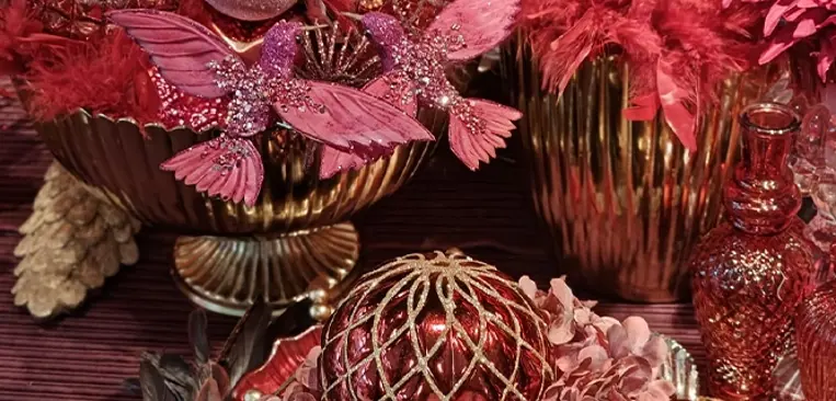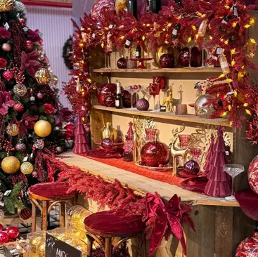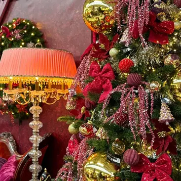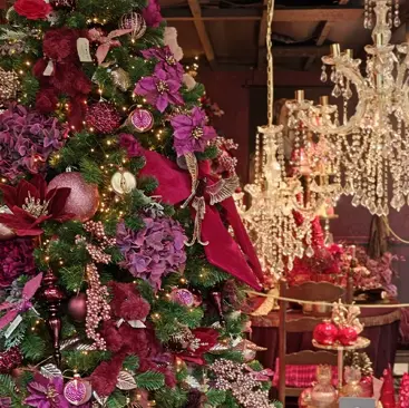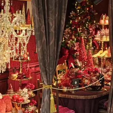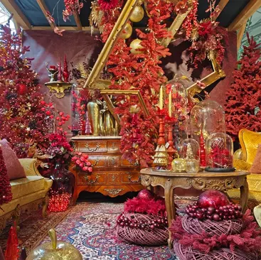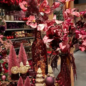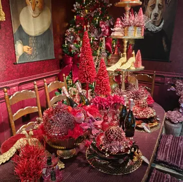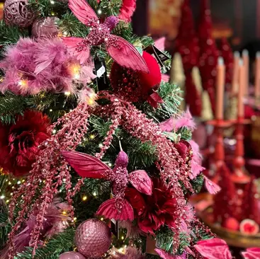 Burgundy Bloom staat voor luxe, glamour en warmte. Rode en roze kerstbomen, gouden details en velvet creëren een opvallende en stijlvolle sfeer die je direct betovert. Dit thema laat zien dat een kerstboom niet altijd groen hoeft te zijn en dat durf, elegantie en rijkdom perfect samengaan.