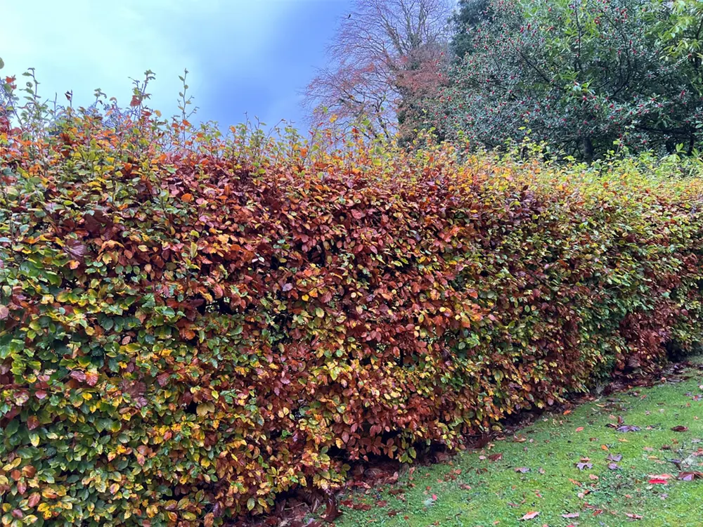 Een beukenhaag is bladverliezend, maar het verdorde blad blijft in de winter grotendeels aan de takken hangen. Zo blijft je tuin ook in de koude maanden beschut tegen inkijk.