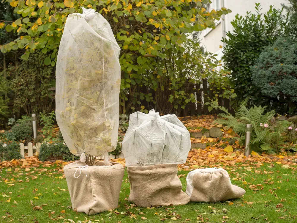 Bij die planten is het namelijk niet voldoende om een beschermend laagje rond de stam of de wortels te voorzien. Je beschermt ze dan ook best volledig door ze te bedekken met een vliesdoek tegen vorst.